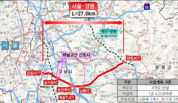 서울-양평 고속도로는 서울 송파구를 시점으로 양평까지 이어지는 총연장 27km, 총사업비 1조4018억원의 대규모 사업이다. 내년부터 타당성조사가 시작될 예정이며 2031년개통을 목표로 추진된다.