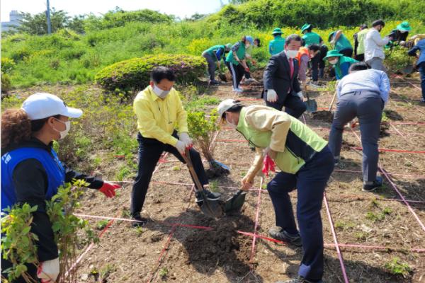 이날 행사는 자연과 환경을 지키며 새로운 미래를 만드는 '구리家 그린, 그린뉴딜 구리'의 일환으로 코로나19 방역수칙을 철저히 준수하며 안승남 구리시장과 김형수 구리시의장 등이 참석한 가운데 시에서 지원된 철쭉 1,000주를 심었다.