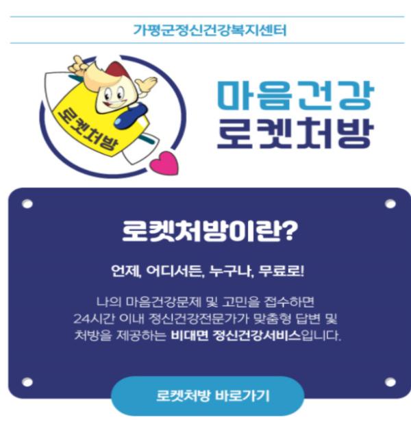 이용을 원하는 주민은 PC 및 모바일로 ‘가평군정신건강복지센터 마음건강로켓처방’을 검색하거나 홈페이지를 통해 참여할 수 있다.
