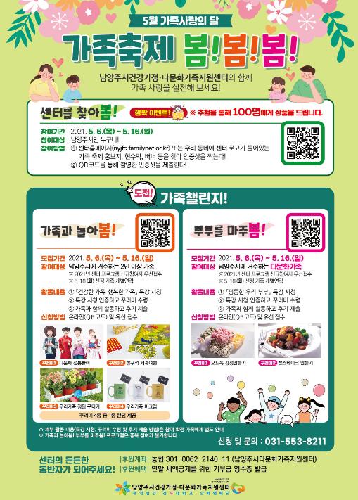 [KNT한국뉴스타임] 남양주시 건강가정·다문화가족지원센터는 5월 가족사랑의 달을 맞이하여 가족촉제 ‘봄봄봄’을 개최한다고 전했다.