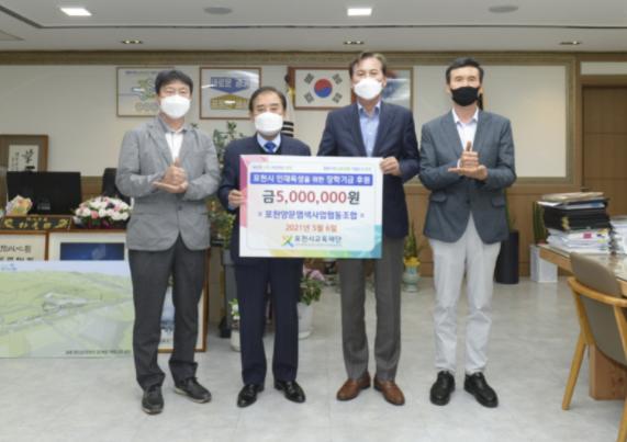 (재)포천시교육재단(이사장 박윤국)은 6일 포천양문염색사업협동조합(이사장 이향래)으로부터 우수인재 양성을 위한 장학기금 500만 원을 기탁 받았다고 밝혔다.