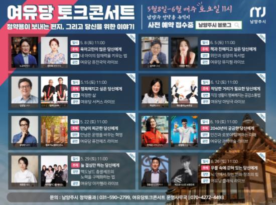 [KNT한국뉴스타임] 남양주시는 오는 5월 8일부터 6월까지 매주 토요일 11시에 정약용유적지에서 ‘여유당 토크콘서트’를 개최한다.