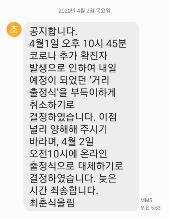 이어서 4월 2일 오전10시에 온라인 출정식으로 대체하기로 결정했다고 전했다.