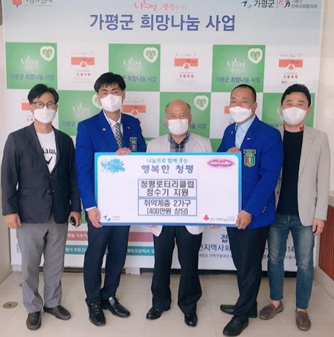 [한국뉴스타임=청평] 청평로타리클럽은 5월 13일 청평면 행정복지센터를 방문하여 청평면에 거주하고 계시는 취약계층(조손가정 등)을 위해 정수기(400만원 상당)를 지원하였다.