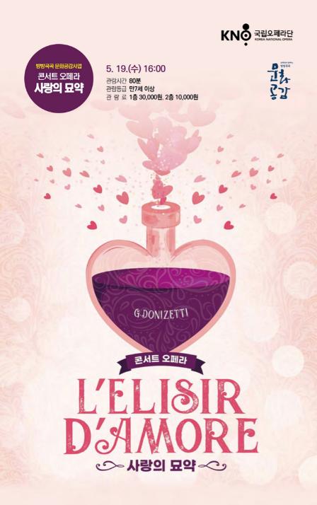 콘서트오페라 ‘사랑의 묘약’은 아름다운 멜로디를 통해 인간의 감정을 잘 드러낸 도니체티의 대표작으로, 가정의 달인 5월을 맞아 어린이를 포함하여 오페라를 처음 관람하는 관객들도 편안하게 즐길 수 있을 것으로 기대된다.