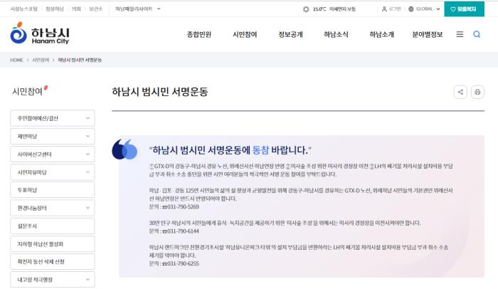 주요 내용은 ▲GTX-D 노선 강동구-하남시 경유 및 위례신사선 하남 연장 반영 ▲미사리 경정장 이전 ▲LH의 폐기물처리시설 부담금 반환 소송 중단을 촉구하는 것으로, 시는 서명운동에 시민들의 적극적인 참여를 요청했다.