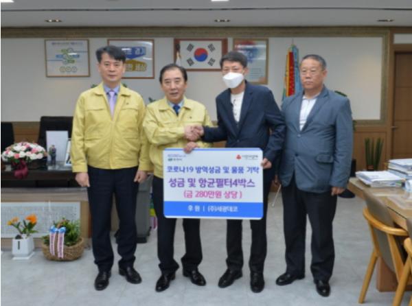 세광데코(대표 윤수헌)는 지난 2일 코로나19로 인해 어려움을 겪고 있는 이웃들에게 사용해달라며 방역기금(100만원) 및 항균필터 4박스(180만원 상당)를 포천시에 전달했다.
