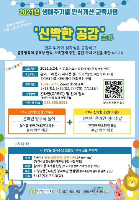 교육을 원하는 가정은 5월 25일부터 남양주시 건강가정 다문화 지원센터 홈페이지를 통해 신청‧접수할 수 있다.