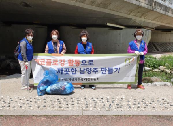 [한국뉴스타임=명기자] 바르게살기운동 남양주시협의회 여성회위원회(총무 박현실)는 26일 호만천 주변 산책로에서 에코플로깅(Eco-plogging) 활동을 실시했다.