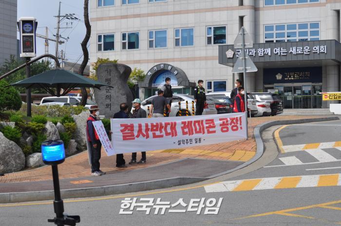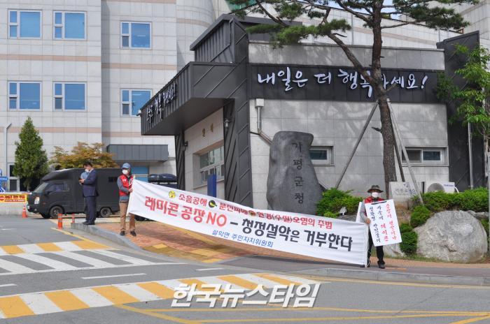 [한국뉴스타임=이명수기자] 26일 오전 가평군 ‘설악면 레미콘 공장 반대 대책위원회’가 가평군청 앞에서 반대 시위에 나섰다.