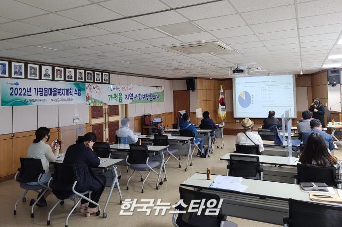 [한국뉴스타임=명기자] 가평군지역사회보장협의체(이하 지사협)는 26일 가평읍행정복지센터에서 가평읍 지사협 위원들이 참석한 가운데 2022년 가평읍 마을복지계획 수립 워크샵 및 제5월 정기회의을 개최하였다.