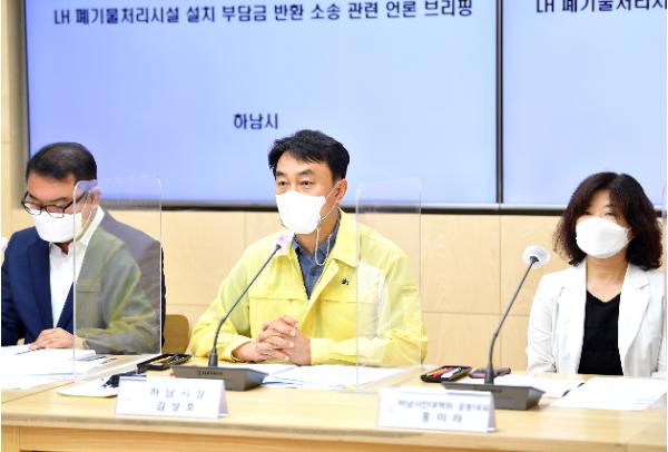 [한국뉴스타임=명기자] 하남시 김상호 시장은 27일 LH와의 폐기물처리시설 부담금 부과처분 취소 소송 관련 언론브리핑에서 LH에 폐기물처리시설 소송 중단을 촉구했다.