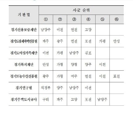 경기신용보증재단, 경기도농수산진흥원, 경기복지재단, 경기연구원, 경기도여성가족재단은 탈락한 시·군 없이 모두 2차 심사를 거쳤다.