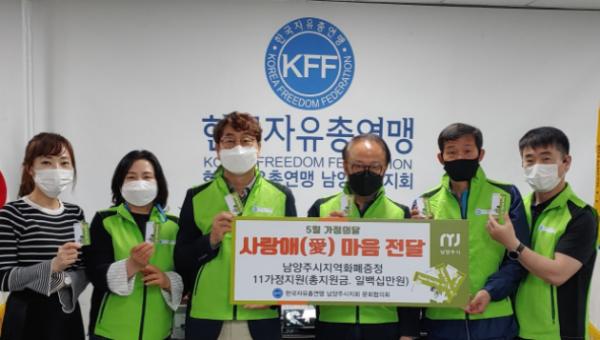 [한국뉴스타임=명기자] 자유총연맹 남양주시지회(지회장 곽민승)는 27일 자유총연맹 사무실에서 소외계층을 돕기 위한 성금을 전달하는 시간을 가졌다.