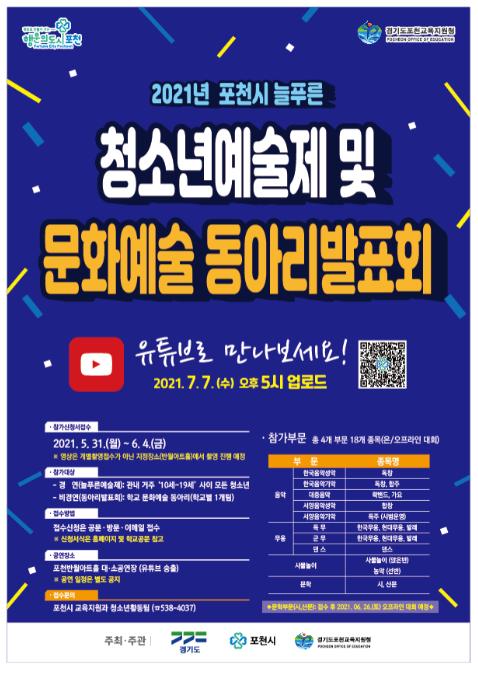 올해로 23회를 맞는 포천시 늘푸른청소년예술제는 코로나19 확산방지를 위해 온라인으로 영상접수가 이루어지며, 심사 또한 비대면으로 진행된다. 단, 문학부문은 대면으로 경연할 예정이다.