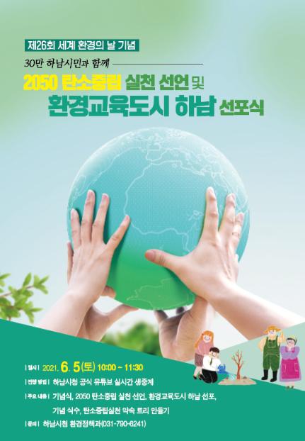 [한국뉴스타임=명기자] 하남시는 ‘제26회 세계 환경의 날’인 다음 달 5일, 하남유니온파크 광장에서 ‘2050 탄소중립 실천’ 및 ‘환경교육도시 하남’을 선포하는 행사를 개최한다고 28일 밝혔다.