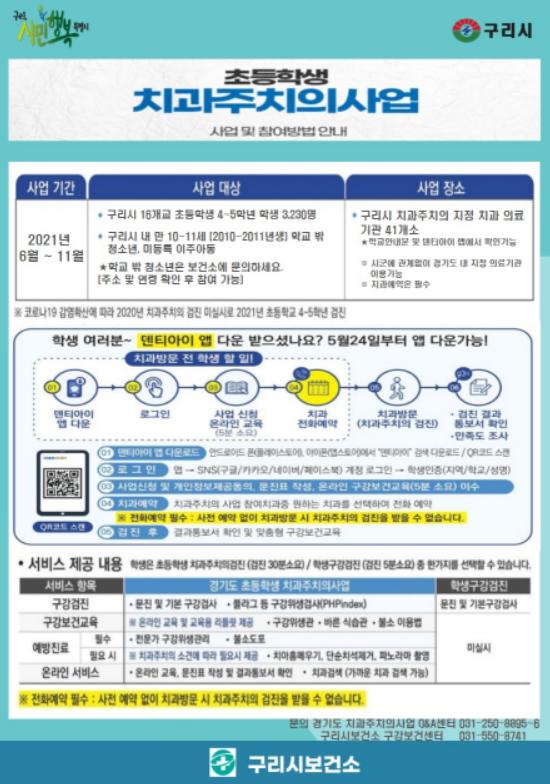 [한국뉴스타임=명기자] 구리시는 6월부터 11월까지 관내 16개교 초등학생 4~5학년 약 3,230명을 대상으로 경기도 초등학교 치과주치의 사업을 실시한다.