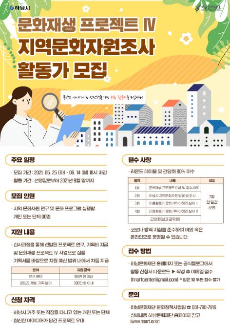 문화기획에 관심이 있고, 하남시 문화자원 발굴에 좋은 아이디어가 있는 하남시민 누구나 참여할 수 있으며 모집 기간은 5월 25일부터 6월 13일까지 20일간이다. 자세한 내용은 하남문화재단 홈페이지를 통해 확인할 수 있다.
