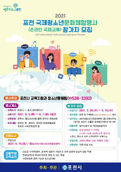 이번 포천 온라인 국제청소년문화체험행사는 오는 8월 5일부터 7일까지 3일간 온라인 플랫폼을 이용하여 실시간 비대면 방식으로 진행된다. 주요내용은 온라인 개·폐막식, 문화체험교류, 자국 문화경연 등 포천시와 화이베이시의 역사문화체험을 온라인으로 소통하는 프로그램으로 구성 운영된다.