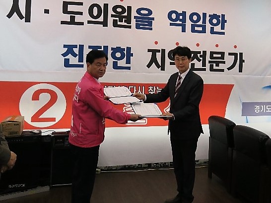 미래통합당 최춘식 후보는 7일, 신읍동에 위치한 선거사무소에서 조해승 한국주민자치중앙회 경기북부권 공동회장을 비롯한 관계자 10여명이 참석한 가운데, 한국주민자치중앙회(회장 전상직)와 정책협약을 맺었다.