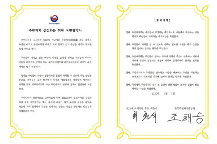 이날 협약식은 주민자치의 주민 주체화, 주민자치회의 설치 및 운영에 관한 법률 입법 등 주민자치의 실질화를 위한 정책 내용으로 이루어졌다.