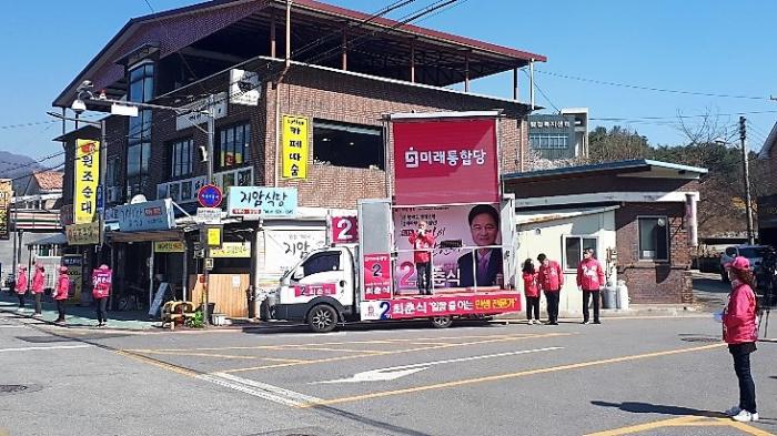[가평뉴스타임=명기자] 8일 오전 미래통합당 최춘식 후보가 북면 터미널에서 가평군 첫 유세 일정을 시작했다.