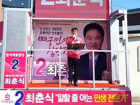 이날 최춘식 후보는 경제파탄의 책임있는 현정부를 비판하고 보수가 승리하여 이 나라 경제가 바로 설 수 있도록 적극적 지지를 호소했다. 이어 보수대통합을 이룬 후보자 본인이 국회에 진출하여 가평군과 포천시를 더욱 더 발전시킬 수 있도록 기회를 달라고 했다.또한 코로나19 사태로 일일이 착자 뵙고 인사드리지 못한 것에 안타까움을 표하며, 각 가정의 건강을 기원했다.
