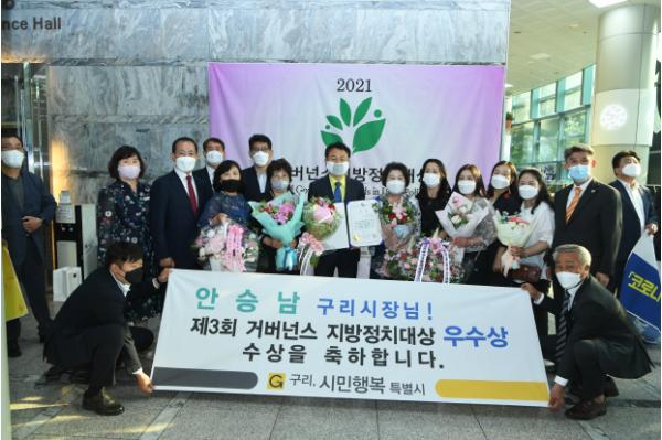 안승남 시장은 수상 소감을 통해“지난 3년간 시민의 행복을 위해 노력한 공로를 인정 받은 것 같아 기쁘면서도 한편으로는 코로나19로 어려움을 격고 있는 시민들을 생각하면 마음이 아프다”며 “이번 수상을 계기로 우리 구리시가 진정으로 시민이 행복한 도시로 거듭날 수 있도록 8백여 공직자들과 함께 더욱 노력하겠다”고 말했다.