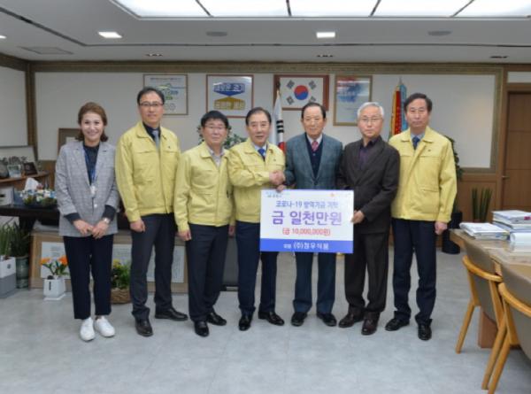 [KNT한국뉴스타임] 포천시에 본사를 두고 있는 ㈜청우식품(회장 박윤구)은 코로나19 극복을 위해 애쓰고 있는 포천시에 방역기금 1천만원을 기탁했다.