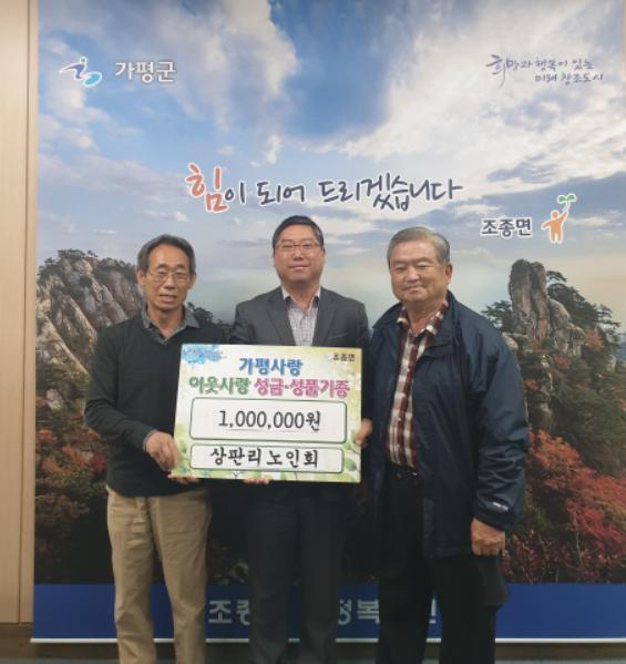 [KNT한국뉴스타임] 가평군 조종면 상판리 노인회(노인회장 박래선)는 7일 자체 모금을 통해 마련한 100만원을 어려운 가정에 써달라며 조종면행정복지센터 맞춤형복지팀을 찾아왔다