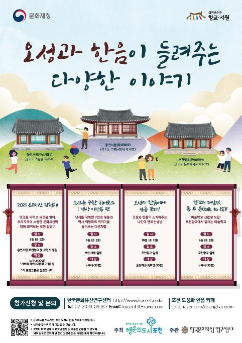 세부 프로그램은 ▲향교의 재발견, 톡 투 유(talk to 儒)! ▲2021 온고지신 탐험대 ▲조선을 구한 히어로즈: 백사 이항복 편 ▲오성과 한음에게 길을 묻다! 등 다채로운 역사교육 체험프로그램을 진행할 예정이다.