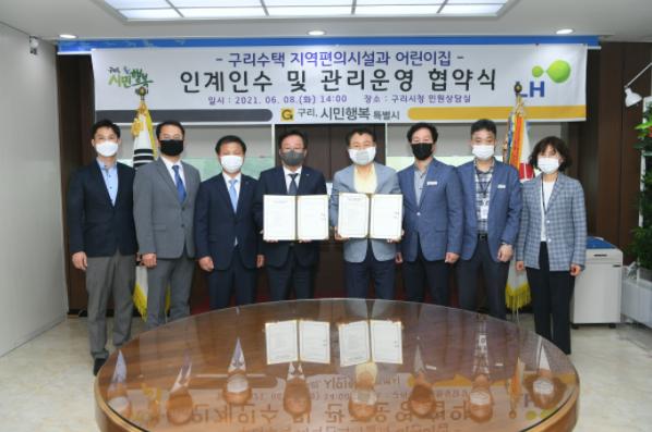 [한국뉴스타임=명기자] 구리시는 8일 시청 민원상담실에서 한국토지주택공사 서울지역본부(주거복지사업처장 주양규)와 「구리수택 지역편의시설과 시립 행복가득어린이집 인계인수 및 관리운영 협약」을 체결했다.