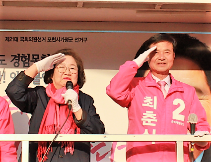 [포천뉴스타임=이기자] 12일 오후 독립운동가 김좌진 장군의 손녀이자 탤런트 송일국의 어머니로 유명한 김을동 전 의원이 미래통합당 최춘식 후보를 격려하기 위해 포천시 신읍사거리를 방문했다.