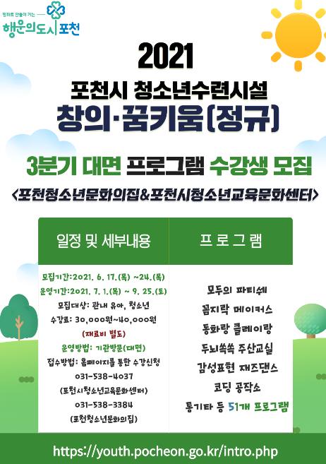 [한국뉴스타임=명기자] 포천시 청소년수련시설(포천시청소년교육문화센터, 포천청소년문화의집)는 관내 청소년을 대상으로 대면 창의교육·꿈키움(정규)프로그램을 운영한다.