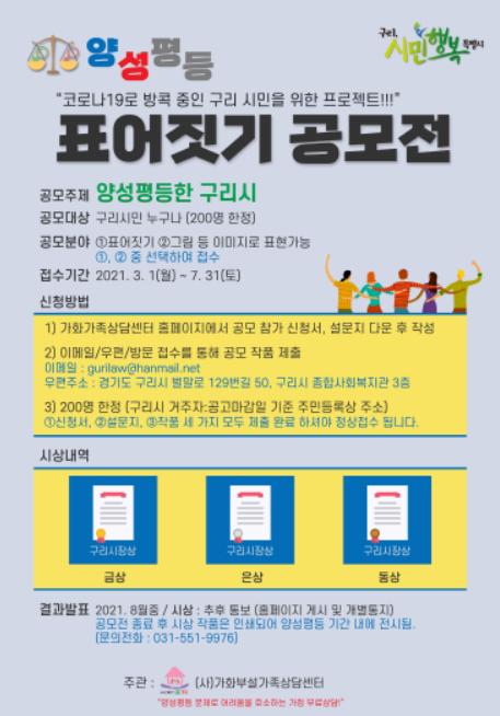 [한국뉴스타임=명기자] 구리시는 3월부터 구리 시민을 대상으로 (사)가화부설가족상담센터(센터장 전병화)에서 구리 시민의 양성평등 문화 확산을 위한‘양성평등 표어짓기 공모전’을 진행하고 있다.