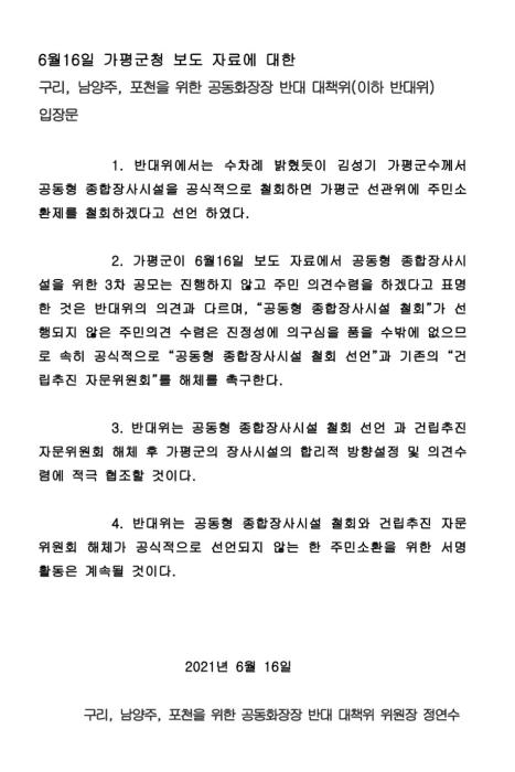 2. 가평군이 6월 16일 보도자료에서 공동형 종합장사시설을 위한 3차 공모는 진행하지 않고 주민 의견수렴을 하겠다고 표명한 것은 반대위의 의견과 다르며, "공동형 종합장사시설 철회" 가 선행되지 않은 주민의견 수렴은 진정성에 의구심을 품을 수밖에 없으므로 속히 공식적으로 "공동형 종합장사시성 철회 선언" 과 기존의 "건립추천 자문 위원회" 해체를 촉구한다.