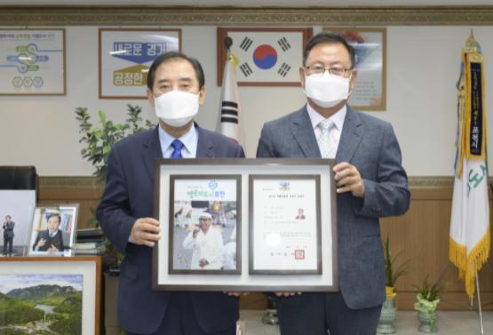 [한국뉴스타임=명기자] 포천시는 지난 16일 경기도 무형문화재 제35호 포천메나리 보유자로 인정된 김영오 보유자에게 무형문화재 보유자 인정서를 전수했다.