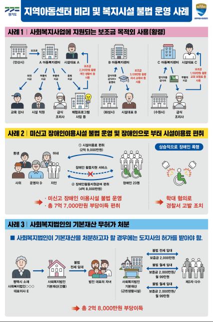 [한국뉴스타임=명기자] 결식아동 급식비 등 보조금 수천만 원을 빼돌려 자녀 교육비로 쓴 지역아동센터 시설장, 장애인복지시설을 신고 없이 운영하면서 장애인들에게 수년간 이용료만 받아 챙긴 운영자 등 불법행위를 저지른 시설장 및 법인대표 6명이 경기도 공정특별사법경찰단 수사에 적발됐다.