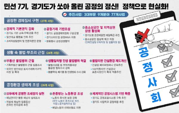 민선 7기 3주년을 앞두고 공정성 확립을 위한 경기도의 노력을 ▲공정한 경제질서 구현 ▲생활 속 불법·부조리 근절 ▲공정생태계 조성 등 3대 부문 77개 정책으로 살펴봤다.