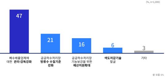이번 종합대책에서 가장 우선적으로 추진해야 할 부분에 대해서는 ‘폐수배출업체 관리감독강화’가 47%로 가장 많았고, 이어 ‘방류수 수질기준 강화’(21%), ‘공공하수처리장 기능 보강 예산 지원 확대’(16%), ‘색도저감기술 발굴’(6%) 순으로 확인됐다.