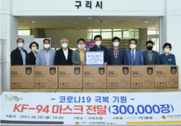 [한국뉴스타임=명기자] 구리시는 28일 3층 시청 민원상담실에서 ㈜베셀(대표이사 이항주)로부터 코로나19 극복을 위한 방역용품인 KF-94마스크 30만장을 전달받았다.