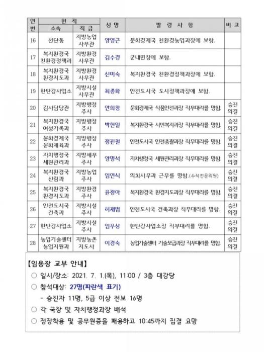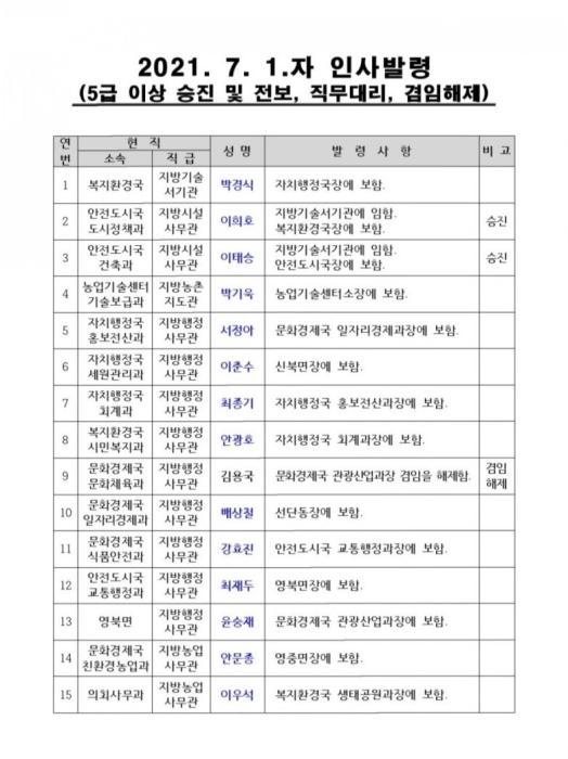 또한 서정아 일자리경제과장, 이춘수 신북면장, 최종기 홍보전산과장, 안광호 회계과장, 배상칠 선단동장, 강효진 교통행정과장, 최재두 영북면장, 윤숭재 관광산업과장, 안문종 영중면장, 아우석 생태공원과장, 양영근 친환경농업과장, 김수경 군내면장 등 5급이상 28명이 승진. 전보. 직무대리. 겸임해제 되었다.