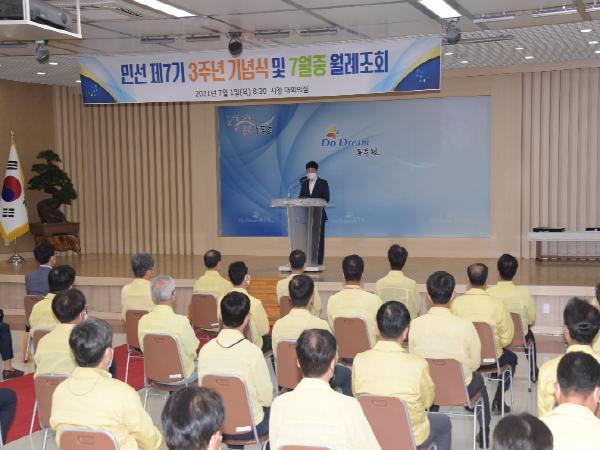[한국뉴스타임=명기자] 최용덕 동두천시장은 1일 시청 대회의실에서 개최된 월례조회에서 민선 7기 취임 3주년 기념사를 발표했다.