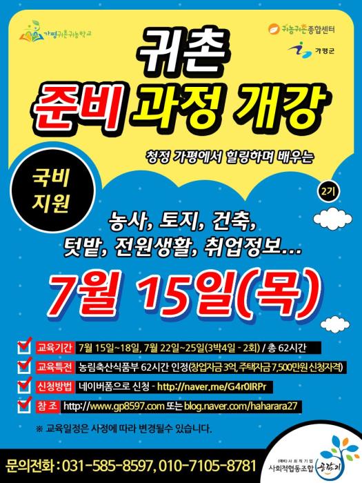 가평귀촌귀농학교 관련 문의는 사무국(031-585-8597)으로 문의하면 된다.