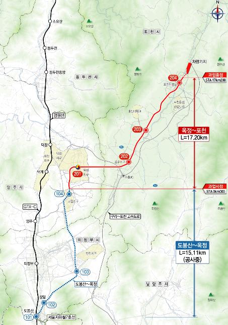 옥정-포천 광역철도 건설사업은 연장 17.2km, 총사업비는 1조 1,762억원이 소요되는 사업으로, 지난 2019년 국가균형발전프로젝트에 선정되어 예비타당성조사가 면제된 이후 사업계획 적정성 검토를 완료했다. 올해 2월 기본계획(안)에 대한 주민공청회 이후 현재는 기본계획 승인을 위한 관계기관 협의를 진행 중이다.