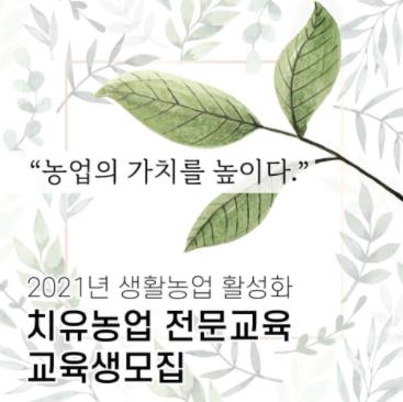 [한국뉴스타임=명기자] 포천시농업기술센터는 2021년 치유농업 전문교육에 참여할 교육생을 7월 14일부터 23일까지 모집한다고 밝혔다.