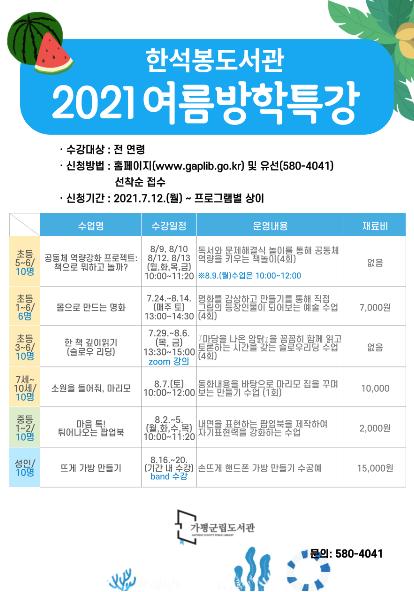 [한국뉴스타임=명기자] 가평군 도서관 4개소(한석봉, 설악, 청평, 조종)는 본격적인 더위가 시작되는 학생들의 여름방학을 맞이하여 다양한 프로그램의 여름방학특강을 개최한다. 코로나 19상황의 장기화로 인해 피로가 누적된 군민들에게 문화적 힐링을 제공하는 취지에서다.
