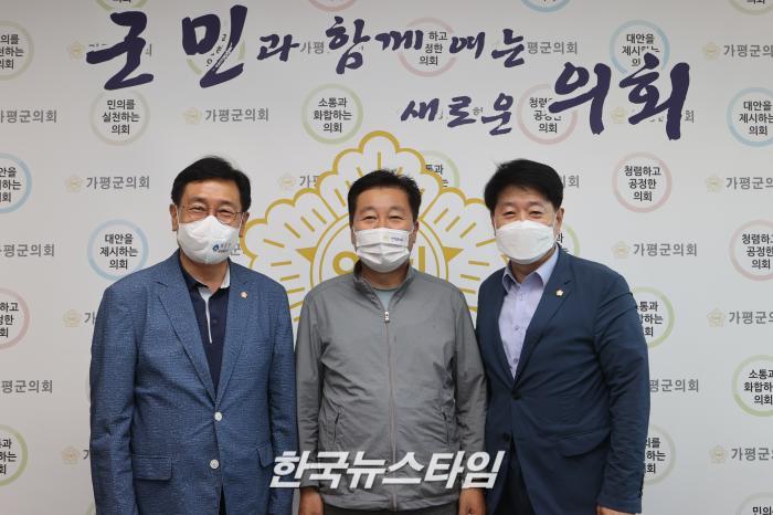 [한국뉴스타임=명기자] 가평군의회 배영식 의장, 양평군의회 전진선 의장, 연천군의회 최숭태 의장은 15일 오전 가평군의회 의장실에서 수도권 사회적 거리두기 4단계 격상에 따른 지역의 상황을 공유하는 등 현안에 대해 논의했다.