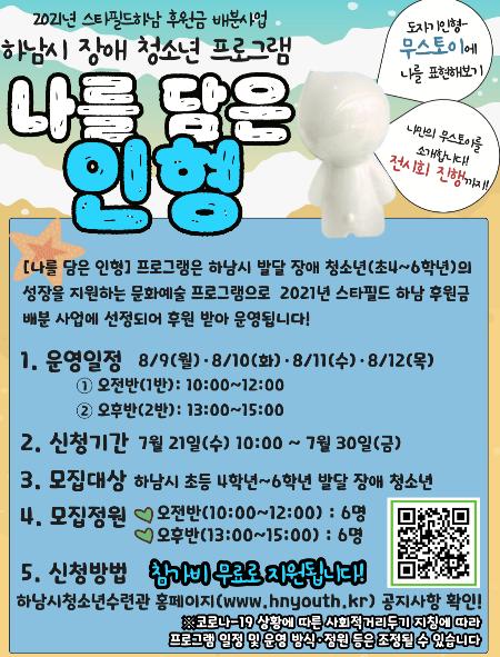 '나를 담은 인형' 프로그램은 2021년 ㈜스타필드 하남 후원금 배분 사업으로 선정되었으며 ㈜스타필드 하남과 하남시사회복지협의회의 후원으로 운영된다. 이용자간 최소 1m 이상의 거리 유지 준수 및 실별 최소 인원 제한 등 사회적 거리두기 지침을 준수해 진행될 예정이다. 자세한 내용은 하남시청소년수련관 홈페이지 공지사항을 통해 확인 가능하다.