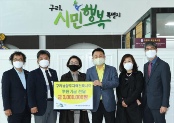 구리시(시장 안승남)는 지난 21일 구리남양주지역 건축사회(회장 최재곤)에서 코로나 19 극복을 위한 후원금 300만원을 구리시종합사회복지관(관장 이상희)에 전달했다고 밝혔다.
